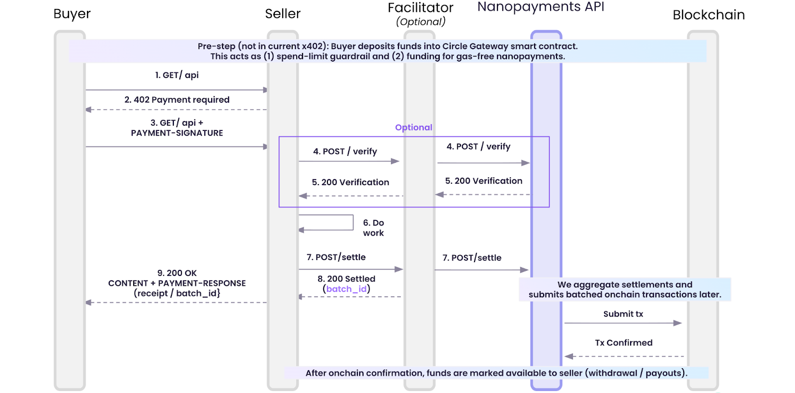 - Confirm payment: Nanopayments returns a successful response to the merchant. From the merchant’s perspective, the payment is final, so the API response or digital resource can be released immediately.