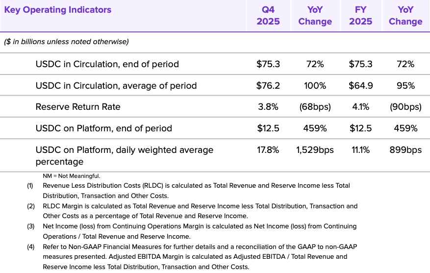 - Circle Payments Network (CPN) Expansion: 55 financial institutions enrolled and 74 going through eligibility reviews as of February 20, 2026. Activity has continued to grow with annualized transaction volume based on the trailing 30 day activity of $5.7 billion as of February 20, 2026.