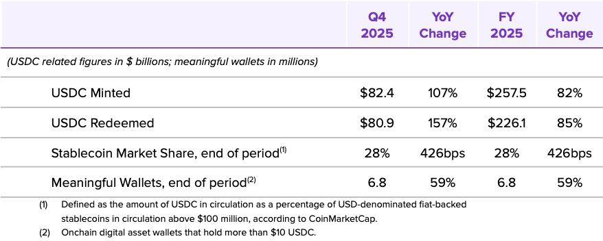 - USDC in circulation of $75.3 billion at year end grew 72%; USDC onchain transaction volume in Q4’25 of $11.9 trillion, up 247%