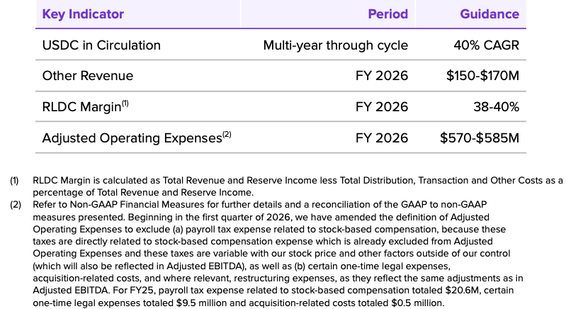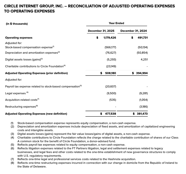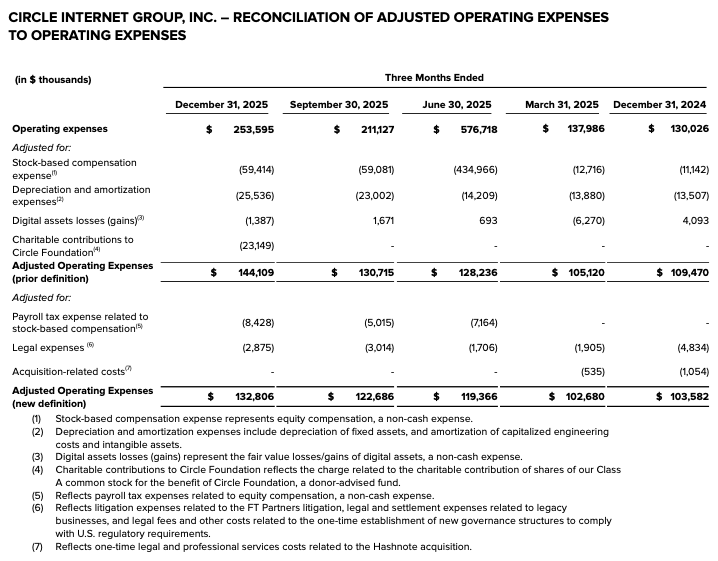 Adjusted Operating Expenses excludes depreciation and amortization, charitable contributions to Circle Foundation, digital assets losses (gains), and stock-based compensation. Beginning in the first quarter of 2026, we have amended the definition of Adjusted Operating Expenses to exclude (a) payroll tax expense related to stock-based compensation, because these taxes are directly related to stock-based compensation expense which is already excluded from Adjusted Operating Expenses and these taxes are variable with our stock price and other factors outside of our control (which will also be reflected in Adjusted EBITDA), as well as (b) certain one-time legal expenses, acquisition-related costs, and where relevant, restructuring expenses, as they reflect the same adjustments as in Adjusted EBITDA.