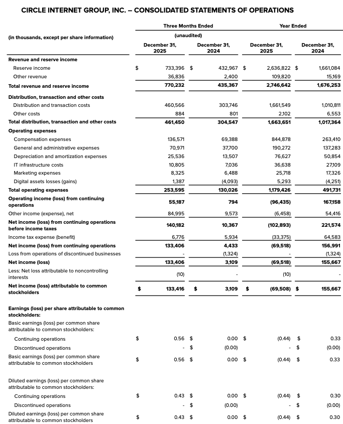 NEW YORK – FEBRUARY 25, 2026 — Circle Internet Group, Inc. (NYSE: CRCL) today announced results for the fourth quarter and full fiscal year 2025.