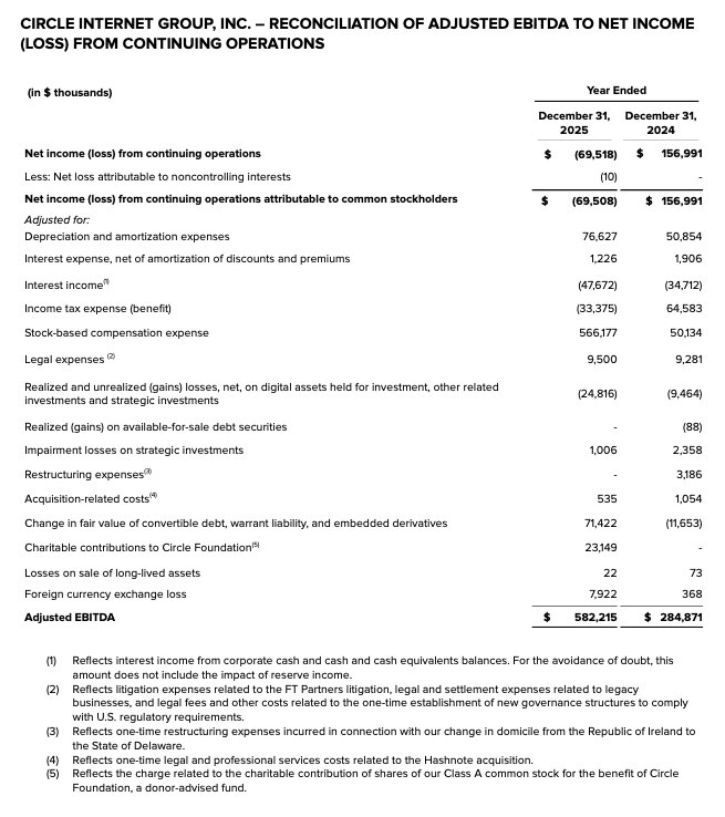 Adjusted EBITDA is calculated as net income (loss) from continuing operations excluding: net income (loss) attributable to noncontrolling interests, depreciation and amortization expenses; interest expense, net of amortization of discounts and premiums; interest income; income tax expense (benefit); stock-based compensation expense; certain legal expenses; realized and unrealized (gains) losses, net, on digital assets held for investment, other related investments and strategic investments; realized (gains) losses on available-for-sale debt securities; impairment losses on strategic investments; restructuring expenses; acquisition-related costs; change in fair value of convertible debt, warrant liability, and embedded derivatives; charitable contributions to Circle Foundation; losses on sale of long-lived assets; and foreign currency exchange loss (gain).